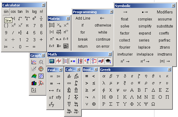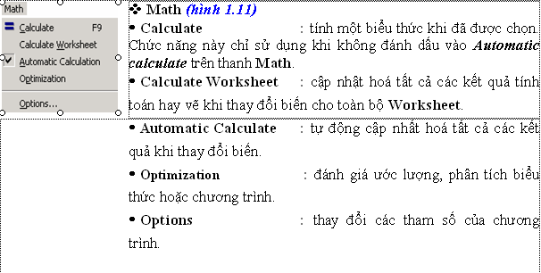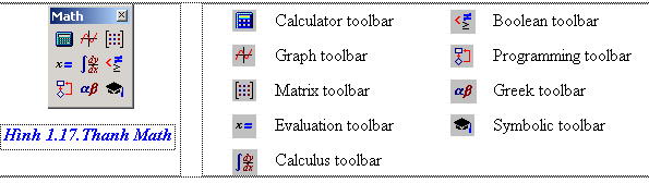 Thanh công cụ Math chuyên dùng để tính toán (hình 1.17), khi nhắp vào mỗi biểu tượng trên thanh công cụ Math thì xuất hiện lần lượt các bảng sau: