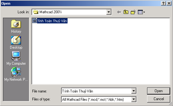 - Mục Files of type: có thể mở các tập tin của Mathcad với các đuôi *.mcd (caùc Worksheet); *.mct (caùc Template); *.hbk (sách giúp đỡ của Mathcad); *.* (hieån thò taát caû caùc taäp tin).