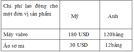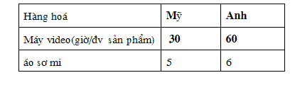 Cần 30giờ ở mỹ để sản xuất ra 1 máy video và 5giờ để sản xuất ra 1 áo sơ mi. lao động ở anh có hiệu suất kếm hơn ;cần 60giờ để làm ra 1 máy video và 6 giờ để sản xuất ra 1 áo sơ mi.