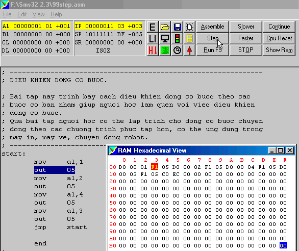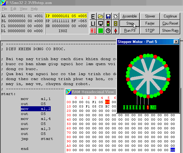 Lệnh OUT 05 xuất dữ liệu chứa trong thanh ghi AL (là 01) sang port 05 điều khiển động cơ bước cho phép nhóm cuộn dây đầu tiên trong 4 nhóm có điện (có thể xem chi tiết hơn về động cơ bước trong phần giới thiệu của đĩa CD này). Con trỏ lệnh IP tự động tăng thêm 2 đơn vị (do lệnh OUT 05 chiếm đến 2 byte nhớ trong RAM) chỉ ra địa chỉ kế tiếp của lệnh mà vi điều khiển sắp thực hiện (MOV AL,2) nằm ở ô nhớ 05. Cũng giống như trên các thanh ghi khác không tham gia nên không thay đổi dưới tác động của lệnh này. Tiếp tục nhấp vào Step , ta nhận thấy:
