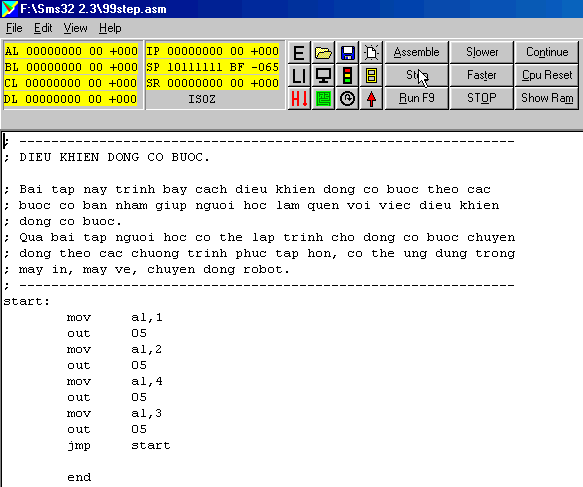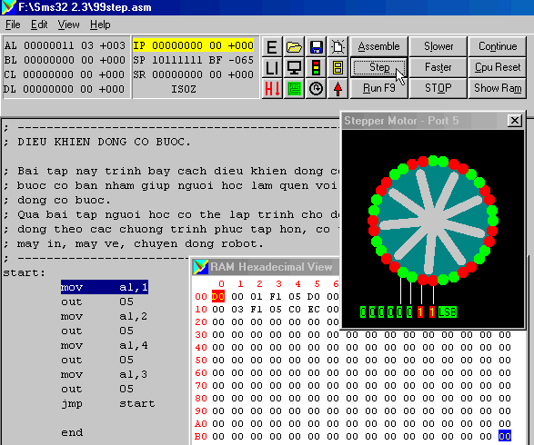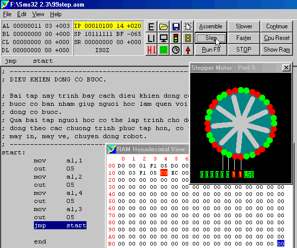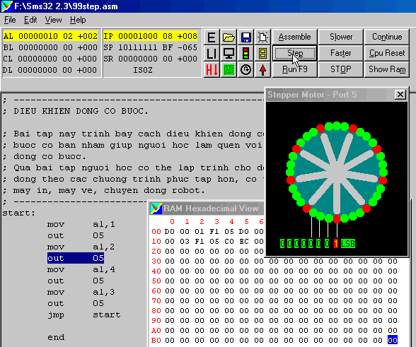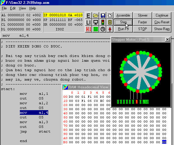 Tương tự, như trên ta thấy tác động của lệnh OUT 05 làm động cơ bước quay đi một góc 10o . Tiếp tục nhấp Step và cứ như thế tiếp tục cho đến lệnh cuối cùng JMP start.