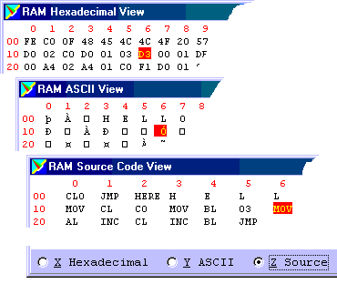 Bộ mô phỏng có 256 byte RAM, có địa chỉ từ 0 đến 255 ( số thập phân) hay từ 00 đến FF (số Hex). Ðịa chỉ của RAM thường được đặt trong dấu ngoặc vuông ví dụ như [7C] trong đó 7C là số Hex. [7C] đọc là dữ liệu cất tại ô nhớ 7C. Trong thực tế, đây chính là? ROM nhưng nói chung chương trình chính sẽ được lưu trữ tại đây.