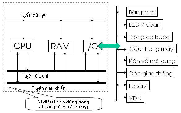Như đã giới thiệu ở phần trước hệ vi xử lý dùng trong chương trình mô phỏng này và hệ vi điều khiển thực tế nói chung bao gồm ba phần chính : bộ vi xử lý (CPU); bộ nhớ và thiết bị xuất nhập (I/O). Cụ thể trình bày trên hình 2-1.