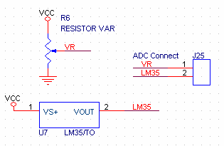 Đầu ra của LM35 và chân 2 biến trở 1K trên Kit được nối vơi 2 jump chờ. Với AMEGA16L có 8 kênh ADC là chức năng thứ 2 của PORTA. Do đó để ADC ta dung dây nối 2 chân đó với 2 bit của PORTA là bit 0 và bit 1..