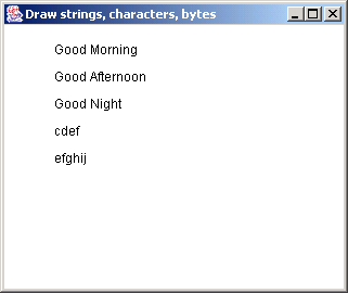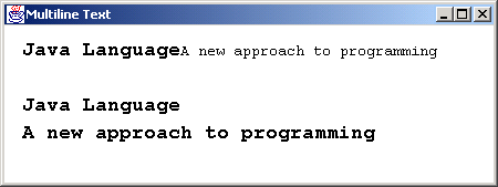Trước tiên chúng ta in msg1 sử dụng font Monospaced. Sau đó, chúng ta in msg2 sử dụng font DiaglogInput. Để làm được điều này, chúng ta cần tính khoảng cách cần thiết để in msg1. Phương thức stringWidth() của lớp FontMetrics được dùng để tính ra tổng khoảng cách cần thiết để in msg1. Khi chúng cộng thêm khoảng cách này vào biến x, chúng ta sẽ lấy được vị trí mà chúng ta bắt đầu in đoạn văn bản kế tiếp, msg2. Phương thức setFont() được dùng để thiết lập font để in văn bản.