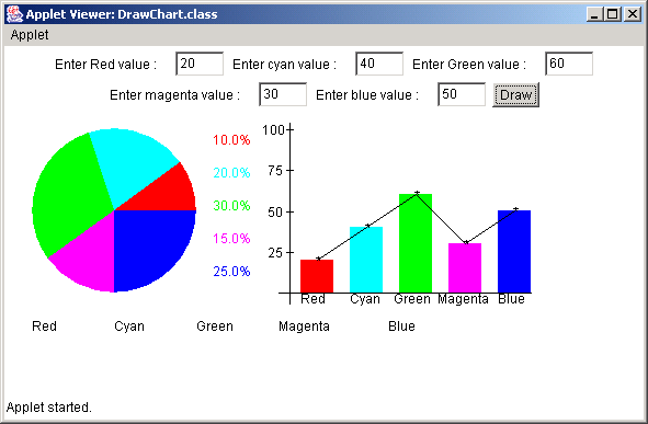 Người sử dụng được phép nhập vào giá trị màu trong các ô tương ứng. Khi click nút 'Draw' các biểu đồ dạng đường, bar, pie được hiện ra.