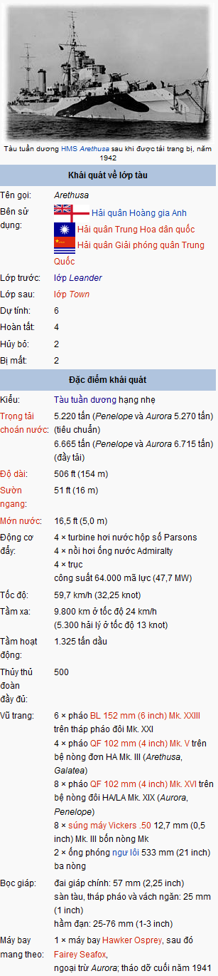 Lớp Arethusa đã chứng tỏ được khả năng trong phục vụ, và thiết kế lườn tàu của nó được áp dụng cho lớp tàu tuần dương Dido năm 1937. Tất cả đầu đã tích cực phục vụ trong chiến tranh, đặc biệt là tại Mặt trận Địa Trung Hải và hai chiếc đã bị mất do trúng ngư lôi từ tàu ngầm đối phương trong khi hoạt động gần bờ. Arethusa cũng suýt bị mất vào tháng 11 năm 1942 khi nó trúng ngư lôi ném từ máy bay. Nó bị ngập nước nặng, bốc cháy và hai trong số ba tháp pháo bị loại khỏi vòng chiến; tuy nhiên nó vẫn sống sót và được sửa chữa tại Charleston, Hoa Kỳ.
