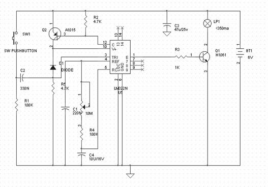 Mạch điện gồm 5 điện trở, 1 biến trở, 1 diode, 4 tụ hóa, 1 nút nhấn, 1 đèn, 1 Transistor PNP, 1 Transistor NPN, 1 IC LM322N, 1 nguồn 1 chiều (Pin), và 1 chân Mass.