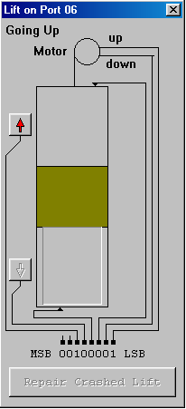Hãy viết chương trình điều khiển thang máy chuyển động theo các nút nhấn lên xuống có trong giao diện phần cứng ở port 06.
