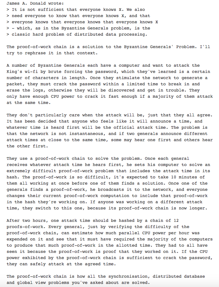 Nakamoto Satoshi cũng từng trực tiếp giải thích về cách Bitcoin dùng PoW để giải quyết bài toán các vị tướng Byzantine trong một email gửi đi ngày 14/11/2008, các bạn có thể xem qua tại đây