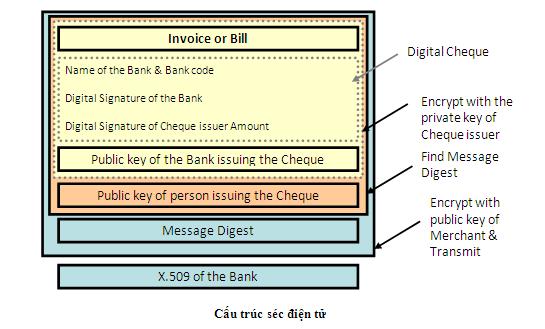 mô tả cấu trúc của séc điện tử sử dụng kỹ thuật mã hóa, kỹ thuật băm và xác thực điện tử.