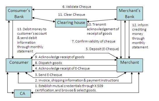 Trong phần này chúng ta chỉ xem xét việc ứng dụng các kỹ thuật bảo mật đã học để bảo vệ thông tin séc điện tử và quá trình giao dịch sử dụng séc này. Hình 8.1 là quy trình mua hàng và thanh toán trên Internet sử dụng séc điện tử.