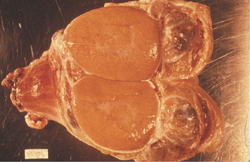 Brucellosis ở cừu: Phụ dịch hoàn sưng to do bị viêm mãn tính (trong trường hợp này cả hai dịch hoàn chưa bị ảnh hưởng)