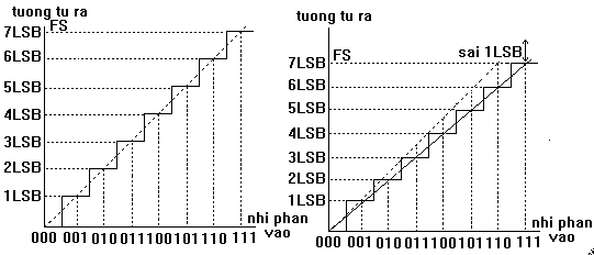 (H 8.4a) là đặc tuyến lý tưởng, tuy nhiên, trong thực tế để đường trung bình của đặc tính chuyển đổi đi qua điểm 0 điện thế tương tự ra được làm lệch (1/2)LSB (H 8.4b). Như vậy điện thế tương tự ra được xem như thay đổi ở ngay giữa hai mã số nhị phân vào kế nhau. Thí dụ khi mã số nhị phân vào là 000 thì điện thế tương tự ra là 0 và điện thế tương tự ra sẽ lên nấc kế 000+(1/2)LSB rồi nấc kế tiếp ở 001+(1/2)LSB.v.v....Trị tương tự ra ứng với 001 gọi tắt là 1LSB và trị toàn giai VFS = 7LSB tương ứng với số 111