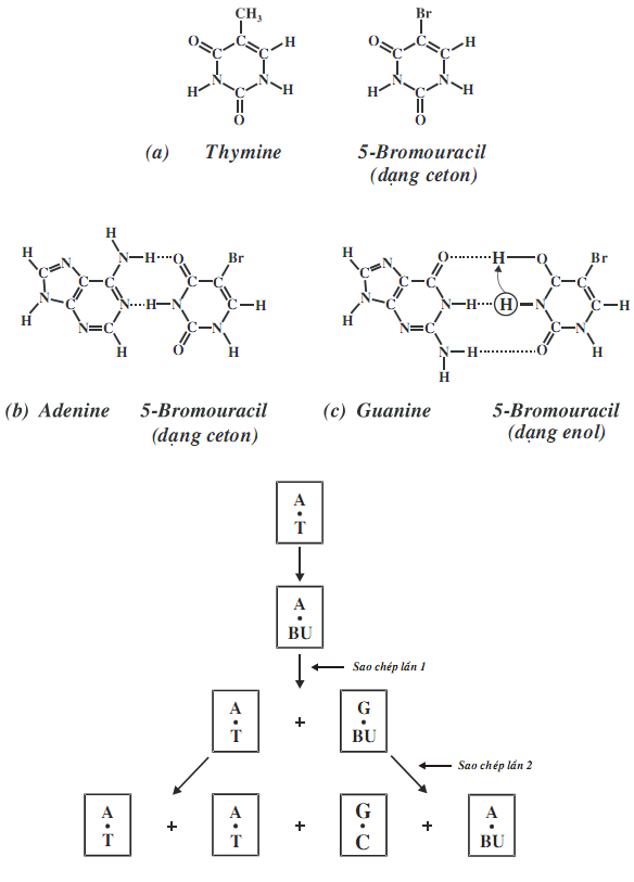 - Dùng các chất hoá học gây đột biến. Hiện nay người ta đã sử dụng nhiều loại chất hoá học khác nhau để làm thay đổi cấu trúc của DNA. Cơ chế tác dụng của mỗi tác nhân hoá học lên DNA là khác nhau: Có loại tác động vào giai đoạn sao chép, làm sai hỏng DNA trong giai đoạn sao chép như bromouracil hay 2-amino purine là các đồng đẳng của bazơ purine và uracil, cũng có loại tác động trực tiếp lên gen, làm biến đổi các bazơ nitơ. Ví dụ trường hợp tác động của bromouracil: Do đặc điểm cấu tạo của bromouracil mà nó có thể bắt cặp bổ sung với bazơ adenine thay vị trí của thymine, đồng thời cũng có thể bắt cặp bổ sung với bazơ guanine thay vị trí của cytosine (Hình dưới3-2), do vậy, sau vài lần sao chép từ cặp A−T ban đầu có thể chuyển thành cặp G−C.