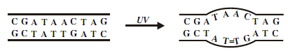 - Dùng tia phóng xạ không ion hoá như tia tử ngoại (UV) để tạo các dimer thymine. Khi chiếu tia tử ngoại, các bazơ thymine nằm kề nhau trên một mạch sẽ liên kết với nhau, làm mất liên kết hydro giữa các bazơ bổ sung giữa hai mạch.