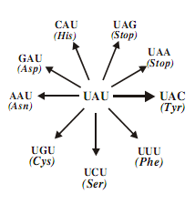 Codon UCU mã hoá cho serine, nếu bị thay đổi bazơ thứ 3 thành UCC, UCA hay UCG, vẫn mã hoá cho serine mà không có gì thay đổi.