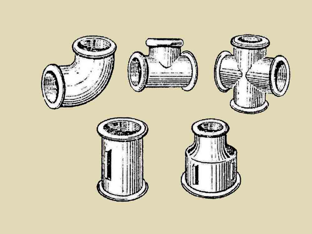 Để nối các đường ống (dẫn hơi, dẫn khí hoặc chất lỏng...) với nhau, người ta dùng phần nối (Hoặc gọi là đầu nối) tiêu chuẩn được chế tạo bằng gang rèn theo quy định trong TCVN 1286 – 85. Đặc trưng của đường ống là "đường thông quy ước": Kích thước thực tế của đường thông qui ước là đường kính lòng ống đo bằng milimét. Ký hiệu của đường ống gồm có đường kính đường thông quy ước: Dqư và số hiệu tiêu chuẩn qui định đường ống.Ví dụ: ống 20 TCVN 1286 - 85– Hình 4.38: Các loại đầu nối bằng gang rèn