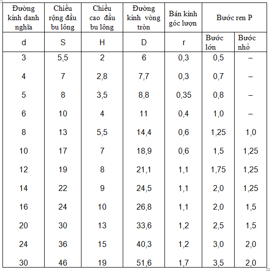 Ghi chú: Dấu x là loại bulông có ren trên suốt chiều dài thân