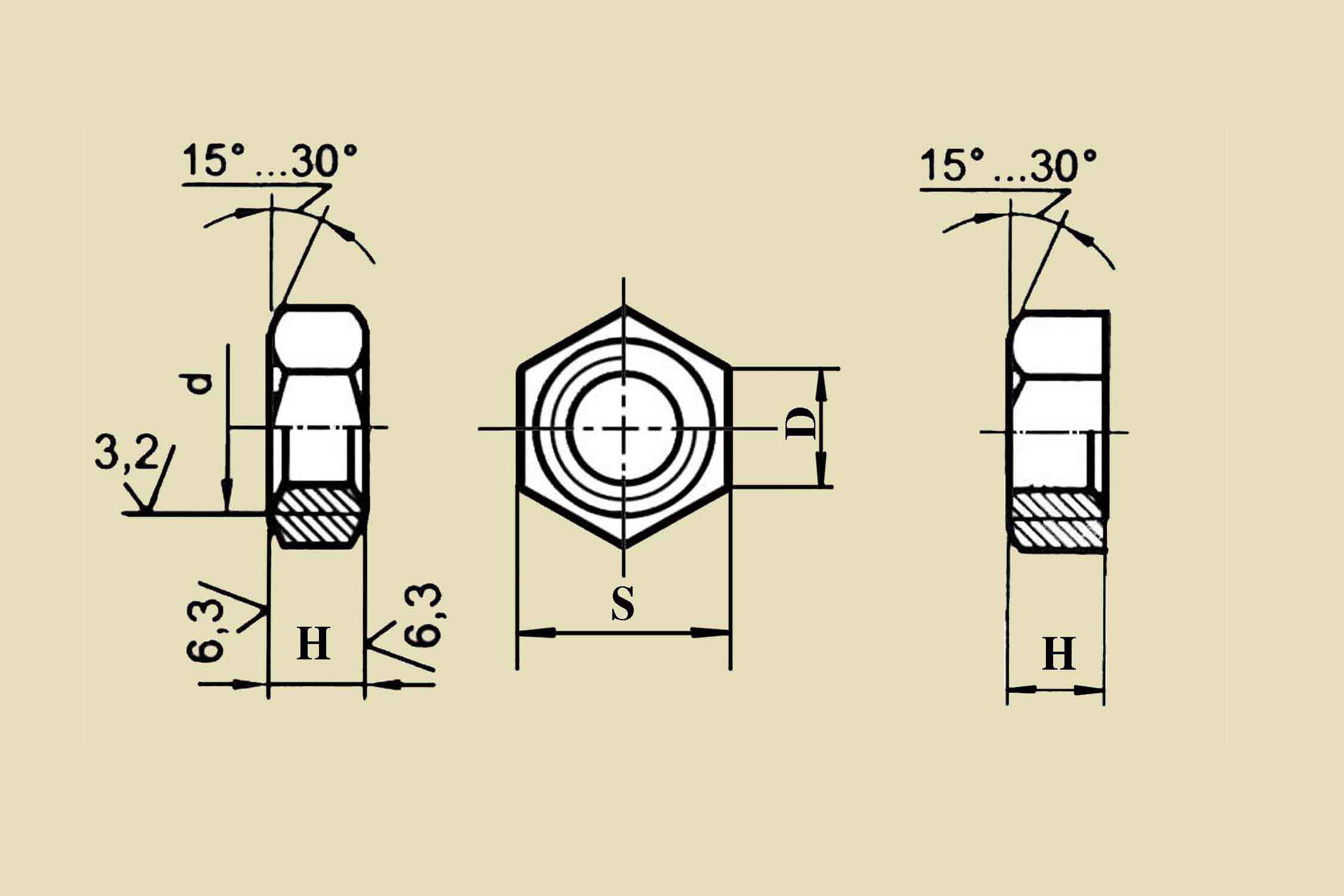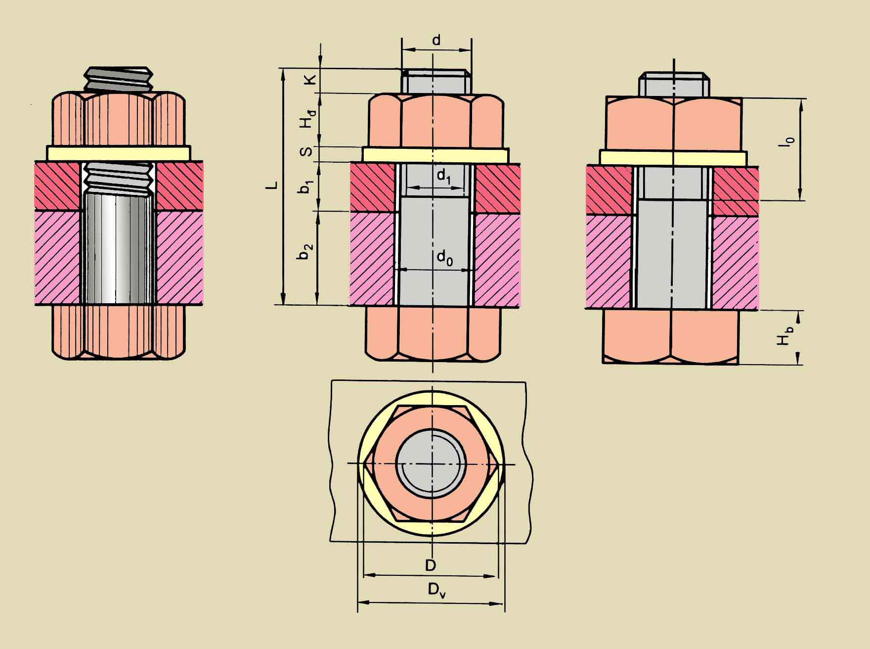 Để đơn giản, mối ghép bu lông được vẽ theo qui ước, các cung hypebôn của đầu bu lông và đai ốc được thay thế bằng cung tròn như hình 4.22 đã hướng dẫn. Các kích thước của mối ghép căn cứ vào đường kính ngoài của ren để tra trong bảng 4.43.Độ dài của bu lông tính theo công thức.