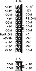 Theo sự quy ước (như hình) thì các đầu nối 20 chân chỉ khác biệt 4 chân dưới cùng. Nếu bỏ các chân 11, 12, 23, 24 (theo quy ước như hình) thì đầu nối 24 chân trở thành đầu nối 20 chân. Chính vì điều này mà một số nguồn máy tính đã thiết kế loại đầu cắm 20+4 chân phù hợp cho cả hai loại bo mạch chủ.