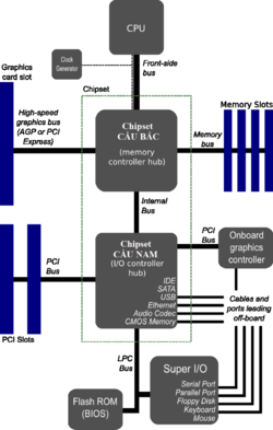 Chipset cầu nam nối với các bộ phận còn lại, bao gồm các thiết bị có tính năng nhập/xuất (I/O) của máy tính bao gồm: các khe mở rộng bằng bus PCI, ổ cứng, ổ quang, USB, Ethernet...