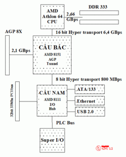Về cơ bản, cấu trúc bo mạch chủ sử dụng CPU của hãng AMD giống như cấu trúc của bo mạch chủ sử dụng CPU của hãng Intel. AMD cũng như nhiều hãng khác đều chưa đưa ra định hướng riêng của mình mà phải theo cấu trúc của Intel bởi sự phát triển của máy tính cá nhân ngay từ thời điểm sơ khai đã phát triển theo cấu trúc nền tảng của các hãng IBM - Intel. Phần này chỉ nói ra những sự khác biệt nhỏ trong cấu trúc bo mạch chủ sử dụng CPU của AMD so với bo mạch chủ sử dụng CPU của hãng Intel: về một số cấu trúc bo mạch chủ cho bộ xử lý AMD có thể cho phép CPU giao tiếp trực tiếp với RAM mà điều này cải thiện đáng kể sự "thắt cổ chai" thường thấy ở cấu trúc bo mạch chủ sử dụng CPU của hãng Intel. Với thế hệ chipset X58/P5x/H5x, Intel đã giảm tải cho chíp cầu bắc bằng việc chuyển các bus giao tiếp với Ram và VGA lên CPU quản lý.