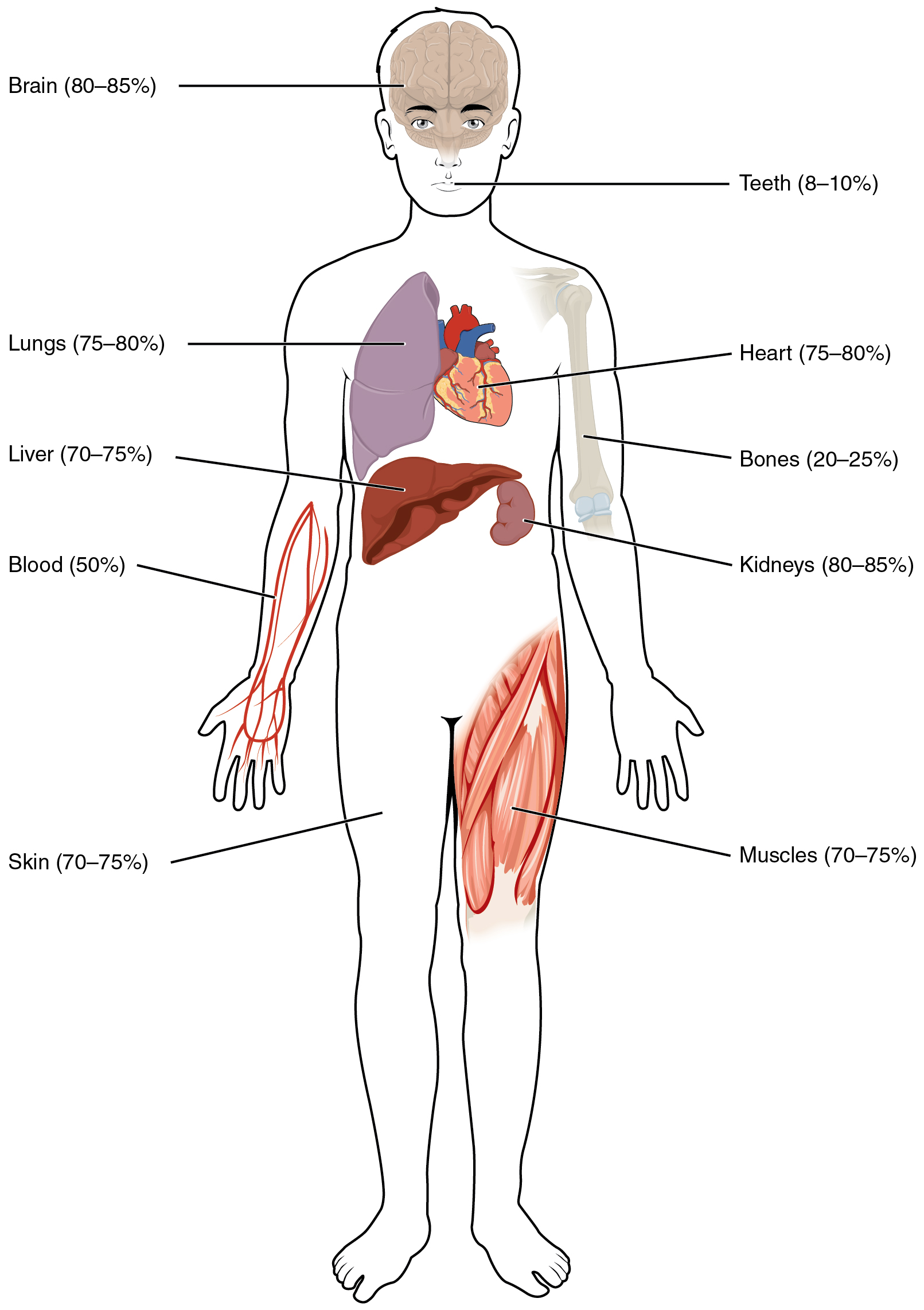 Human beings are mostly water, ranging from about 75 percent of body mass in infants to about 50–60 percent in adult men and women, to as low as 45 percent in old age. The percent of body water changes with development, because the proportions of the body given over to each organ and to muscles, fat, bone, and other tissues change from infancy to adulthood ([link]). Your brain and kidneys have the highest proportions of water, which composes 80–85 percent of their masses. In contrast, teeth have the lowest proportion of water, at 8–10 percent.