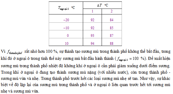Tuy nhiên, chỉ có độ lặp lại của khói nhẹ (SM=1-2 km) và khói vừa (SM=2-6 km) trong thành phố là tăng đáng kể do ảnh hưởng của các tạp chất nhân sinh (bảng 5.4): độ lặp lại của các đợt khói như vậy ở Lêningrat khoảng 2 lần lớn hơn so với ở Sosnovo và Belogorka. Còn về khói nặng (SM=1-2 km) và đặc biệt là sương mù (SM<1 km), thì độ lặp lại của chúng ở thành phố lớn không những không lớn hơn, mà nhỏ hơn so với các vùng ngoại vi: độ lặp lại của các trạng thái với SM<1 km ở Lêningrat 2-3 lần nhỏ hơn so với các địa điểm khác.