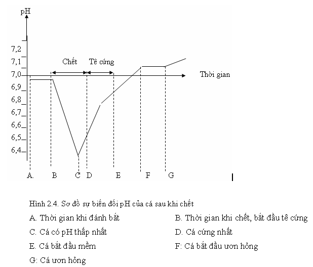 Tóm lại: Cá bắt lên một thời gian rồi chết có pH = 7, sau đó giảm xuống đến pH thấp nhất, cá trở nên cứng. pH giảm đến một mức độ nào đó lại tăng lên gần trung tính, cá lúc này trở nên mềm.
