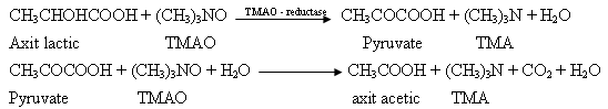 Trước tiên vi khuẩn hiếu khí sử dụng nguồn năng lượng carbohydrate và lactate để phát triển tạo thành CO2 và H2O. Kết quả của tiến trình này làm giảm thế oxy hóa khử trên bề mặt sản phẩm. Dưới điều kiện này, vi khuẩn yếm khí (Alteromonas putrefacien, Enterobacteriaceae) phát triển khử TMAO thành TMA theo bởi các phản ứng sinh hóa:
