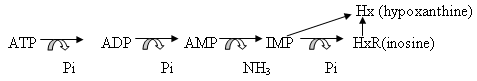 Sau khi chết, ATP bị phân hủy nhanh tạo thành inosine monophosphate (IMP) bởi enzym nội bào (sự tự phân). Tiếp theo sự phân giải của IMP tạo thành inosine và hypoxanthine là chậm hơn nhiều và được xúc tác chính bởi enzym nội bào IMP phosphohydrolase và inosine ribohydrolase, cùng với sự tham gia của enzym có trong vi khuẩn khi thời gian bảo quản tăng. Sự phân giải ATP được tìm thấy song song với sự mất độ tươi của cá, được xác định bằng phân tích cảm quan.