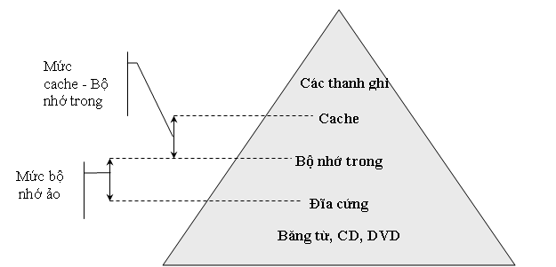 Các đặc tính như lượng thông tin lưu trữ, thời gian thâm nhập bộ nhớ, chu kỳ bộ nhớ, giá tiền mỗi bit nhớ khiến ta phải phân biệt các cấp bộ nhớ: các bộ nhớ nhanh với dung lượng ít đến các bộ nhớ chậm với dung lượng lớn (hình IV.3)