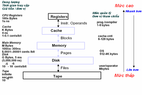 Lower LevelUpper Leveluser/operatorMbytesOS512-4K bytescache cntl8-128 bytesprog./compiler1-8 bytesStagingXfer UnitFilesPagesBlocksInstr. OperandsTapeDiskMemoryCacheRegisters-8Tapeinfinitesec-min10CapacityAccess TimeCost-6-5DiskG Bytes, 5 ms (5,000,000 ns)10 - 10 cents/bitMain MemoryM Bytes100ns- 300ns$.0001-.00001 cents /bitCacheK Bytes4 ns1-0.1 cents/bitCPU Registers100s Bytes1s nsLargerfasterCác đặc tính chính của các cấp bộ nhớ dẫn đến hai mức chính là: mức cache - bộ nhớ trong và mức bộ nhớ ảo (bao gồm bộ nhớ trong và không gian cấp phát trên đĩa cứng) (hình IV.4). Cách tổ chức này trong suốt đối với người sử dụng. Người sử dụng chỉ thấy duy nhất một không gian định vị ô nhớ, độc lập với vị trí thực tế của các lệnh và dữ liệu cần thâm nhập.