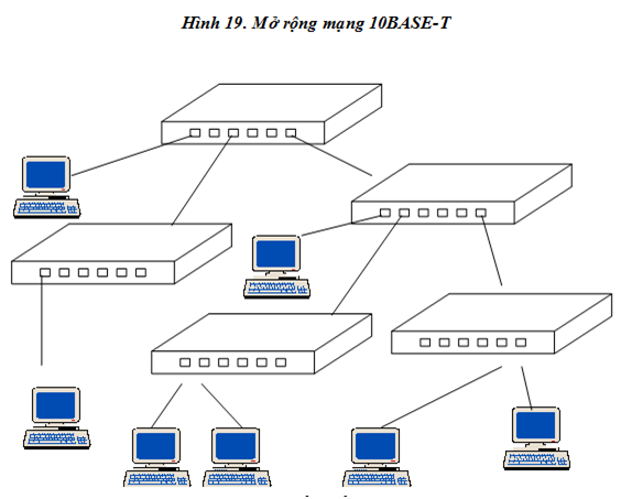 - Vì HUB là một loại Repeater nhiều cổng nên để mở rộng mạng có thể liên kết nối tiếp các HUB với nhau và cũng không được có quá 4 HUB giữa hai trạm làm việc bất kỳ của mạng