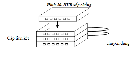 - HUB có khả năng xếp chồng: là loại HUB có cổng riêng để liên kết các chúng lại với nhau bằng cáp riêng thành như một HUB. Như vậy dùng loại HUB này người dùng có thể dễ dàng mở rộng số cổng của HUB trong tương lai khi cần thiết. Tuy nhiên số lượng HUB có thể xếp chồng cũng có giới hạn và phụ thuộv vào từng nhà sản xuất, thông thường không vượt quá 5 HUB.