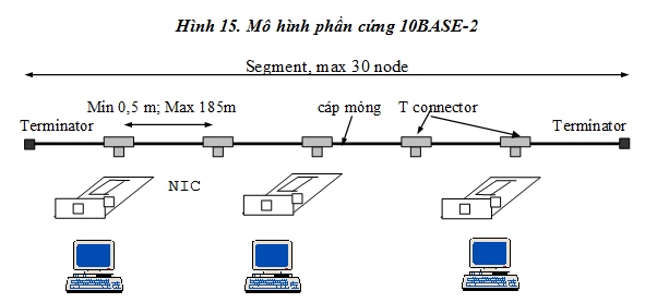 - Việc liên kết các máy tính vào mạng được thực hiện bởi các T - connector và BNC connector.