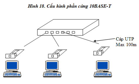 - Mỗi HUB có thể nối từ 4 tới 24 cổng RJ45, các trạm làm việc được kết nối từ NIC tới cổng HUB bằng cáp UTP với hai đầu RJ45. Khoảng cách tối đa từ HUB đến NIC là 100m