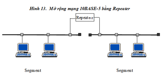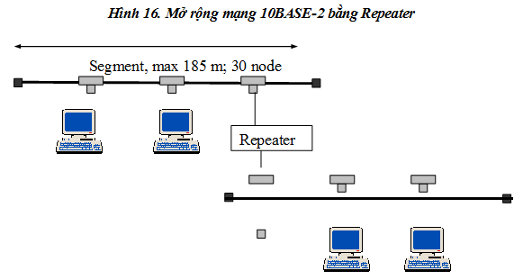 - Repeater: Như đã trình bày ở trên, trong mỗi đoạn mạng dùng cáp đồng trục béo không được có quá 100 AUI, khoảng cách tối đa giữa hai AUI không được vượt quá 500m. Trong trường hợp muốn mở rộng mạng với nhau bằng một thiết bị chuyển tiếp tín hiệu gọi là Repeater. Repeater có hai cổng, tín hiệu được nhận vào ở cổng này thì sẽ được phát tiếp ở ra sau cổng kia sau khi đã được khuyếch đại. Tuy nhiên có những hạn chế bắt buộc về số lượng các đoạn mạng và nút mạng có thể có trên một Ethernet LAN