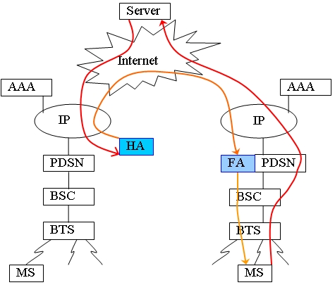 PDSN duy trì 1 ánh xạ logic giữa nhận dạng MS với địa chỉ M . Với 2 địa chỉ M và S thì việc trao đổi gói số liệu không gặp khó khăn khi MS ở trong 1 vùng định tuyến nhưng khi MS chuyển sang một vùng định tuyến mới của PDSN khác thì những gói số liệu từ Server chỉ có thể đến địa chỉ MS theo 1 cơ chế mới có sự hỗ trợ của HA và FA.