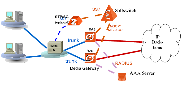 2.3,2.4, trong đó khi một thuê bao khởi tạo một cuộc gọi tới ISP thông qua phần mềm máy tính , GW sẽ kết cuối phiên PPP, nó cung cấp cho user một địa chỉ IP, trong dải địa chỉ IP của nó. Sau đó số bị gọi được gửi cho Softswitch, và Softswitch sẽ ra lệnh cho GW truyền thông kích hoạt thủ tục login vào mạng thông qua phương thức RAS, báo hiệu giữa MG và MGC là MGCP. Thông thường trong thủ tục login vào mạng thì sẽ thực hiện những thủ tục sau nhận thực truy cập Authentication, nhận thực sử dụng dịch vụ Authorization, tính cước Accouting qua AAA Server.