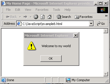 <HTML> <HEAD> <TITLE>My Home Page</TITLE> <SCRIPT LANGUAGE="JavaScript"> <!-- function greeting() { alert("Welcome to my world"); } window.onload = greeting; // --> </SCRIPT> </HEAD> </HTML>Kết quả sẽ tương tự như hình 9