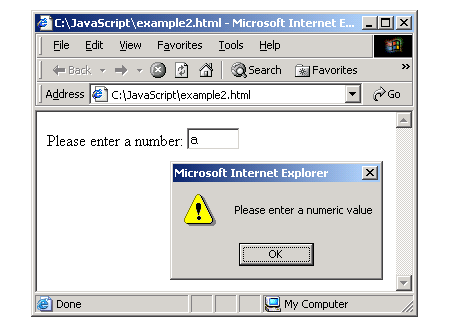 <HTML> <HEAD> <SCRIPT LANGUAGE="JavaScript"> <!--- hide script from old browsers function checkNum(num) { if (num == "") { alert("Please enter a number"); return false; } if (isNaN (num)) { alert("Please enter a numeric value"); return false; } else alert ("Thank you"); } // end hiding from old browsers --> </SCRIPT> </HEAD> <BODY bgColor = white> <FORM> Please enter a number: <INPUT type = text size = 5 onChange="checkNum(this.value)"> </FORM> </BODY> </HTML>Hình 2 và 3 minh hoạ kết quả của đoạn mã trong ví dụ 3