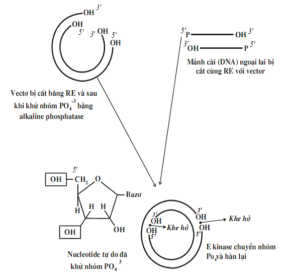 Sự chắp nối vector đã bị khử PO4 ở 5’ với DNA ngoại lai tạo ra DNA tái tổ hợp sợi kép có hai chỗ trống (OH) do OH 3’ của đoạn ngoại lai không tạo liên kết ester với OH 5’ của vector đã khửhóm PO4
