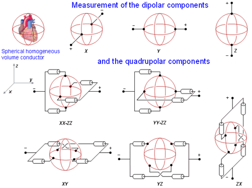 Hình 17.2 miêu tả nguyên lý cơ bản liên quan tới quá trình đo các thành phần lưỡng cực và bốn cực của nguồn nằm trong một khối dẫn dạng cầu. Trong thực tế, thay cho các điện trở trọng số, có rất nhiều các điện cực được sử dụng và các thành phần đa cực được tính toán theo số học. Thủ thuật này được thảo luận ở Pilkington và Plonsey.