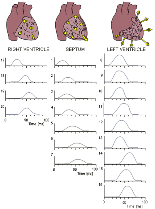 Chúng ta cần chú ý rằng nguồn kết hợp với hoạt động của tim là một lớp kép, mà nó nằm ngay tại bề mặt hoạt động. Lớp kép này xấp xỉ một lưỡng cực. Tương tự như phần hoạt động trong các quá trình xử lý thành tâm thất, lưỡng cực nằm tại vùng trung tâm lực hấp dẫn của vỏ bọc bên ngoài gần ống giác, cũng di chuyển. Do đó vị trí lưỡng điện cực của giũa rãnh di chuyển.