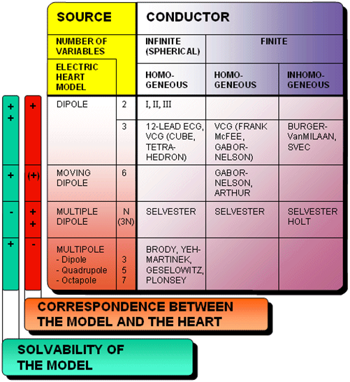 Khẳng định đầu tiên đối với mô hình lưỡng cực của tim được tạo ra bởi E. J. Fischmann và M. R. Barber. Dựa trên ý tưởng này, Ronald Selvester đã cấu tạo nên mô hình tính toán của 20 lưỡng cực. Trong mô hình đầu tiên, ảnh hưởng của vùng tiếp giáp ngực và tính không đẳng hướng bên trong đã bị bỏ quên. Selvester sau đó đã tạo ra một mô hình khác mà trong mô hình này các tác động trên đều được nhắc đến.
