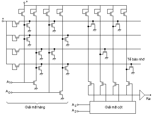 - (H 7.3) là mô hình của một MROM trong đó các ô vuông là nơi chứa (hay không) một linh kiện (diod, transistor BJT hay MOSFET) để tạo bit. Mỗi ngã ra của mạch giải mã địa chỉ gọi là đường từ và đường nối tế bào nhớ ra ngoài gọi là đường bit. Khi đường từ lên mức cao thì tế bào nhớ hoặc từ nhớ được chọn.