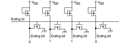 Nếu tế bào nhớ là Diod hoặc BJT thì sự hiện diện của linh kiện tương ứng với bit 1 (lúc này đường từ lên cao, Transsisstor hoặc diod dẫn, dòng điện qua điện trở tạo điện thế cao ở hai đầu điện trở) còn vị trí nhớ trống tương ứng với bit 0.
