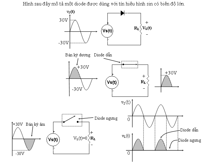 Kết quả là ở nữa chu kỳ dương của tín hiệu, diode dẫn và xem như một ngắt điện đóng mạch. ở nửa chu kỳ âm kế tiếp, diode bị phân cực nghịch và có vai trò như một ngắt điện hở mạch. Tác dụng này của diode được gọi là chỉnh lưu nửa sóng (mạch chỉnh lưu sẽ được khảo sát kỹ ở giáo trình mạch điện tử).
